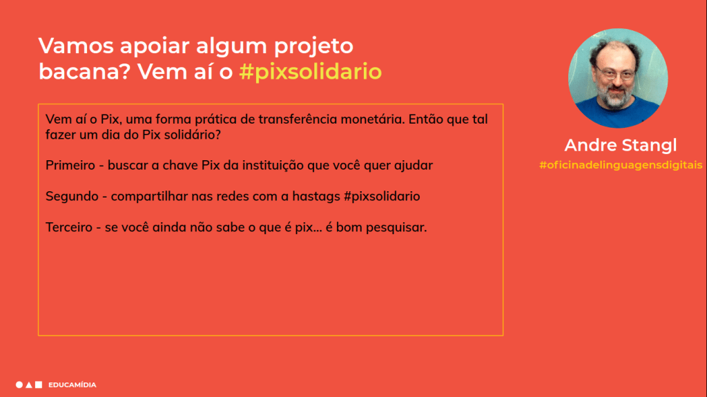 Conheci a proposta do EducaMídia em 2019 em uma reportagem na Folha (link), e desde do começo me identifiquei com os seus anseios. Ao mesmo tempo fui me reinventando, sempre tive um pé na academia e outro fora, assim inspirado pelo EducaMídia fui gestando a ideia da Oficina de Linguagens Digitais.