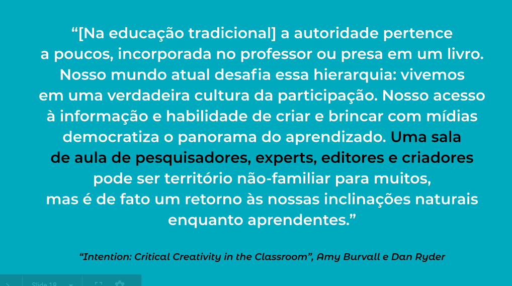 Infelizmente acabei perdendo o encontro on-line do dia 27/10, mas assisti a gravação (e mais uma vez agradeço a simpática menção!). O slide do papo tem dicas legais como o Rio: Alem do mapa e a ferramenta ThingLink. No encontro a Mariana, a Dani e a Carla discutem o papel da criação na aprendizagem, ou seja como podemos usar as linguagens digitais para reinventar a forma como aprendemos.